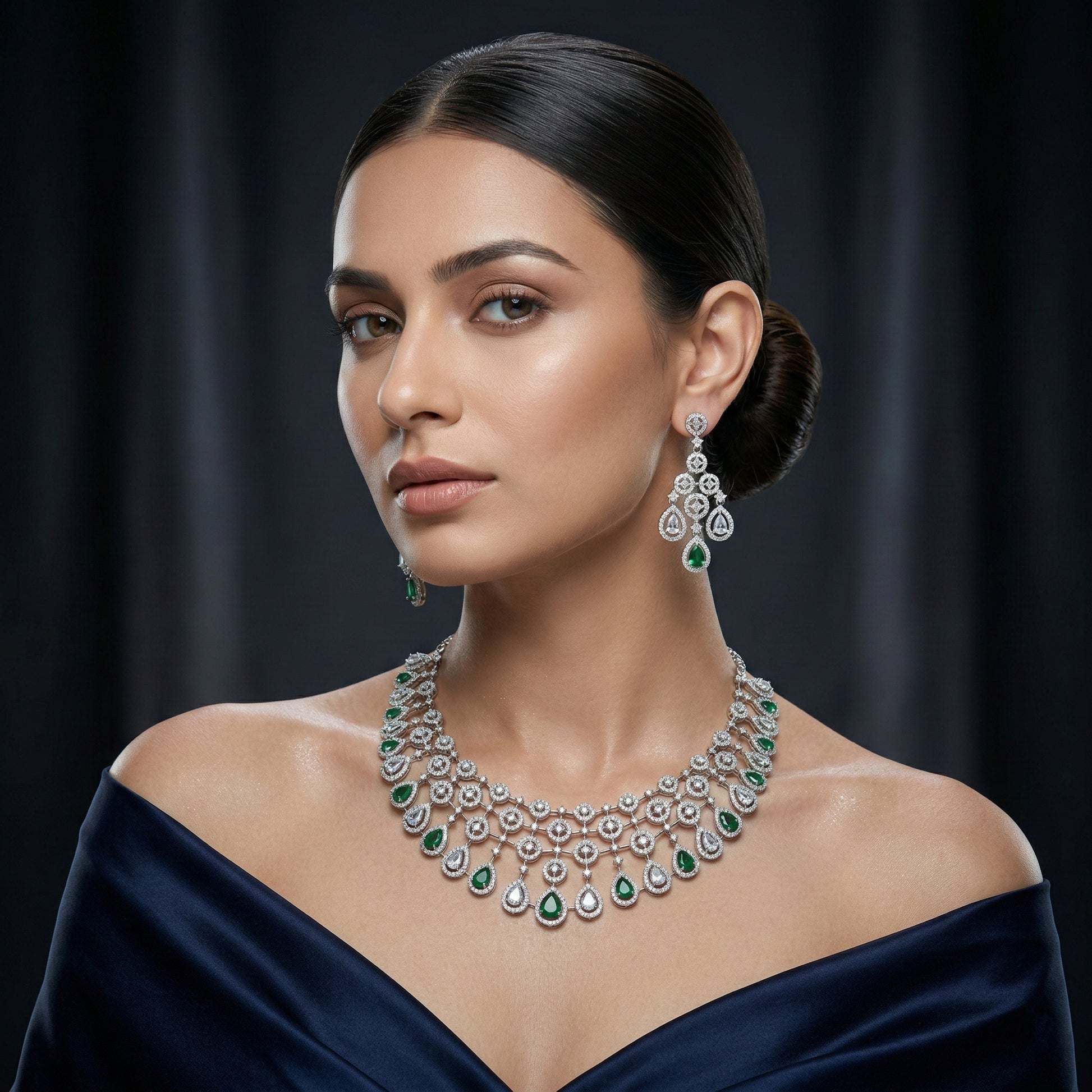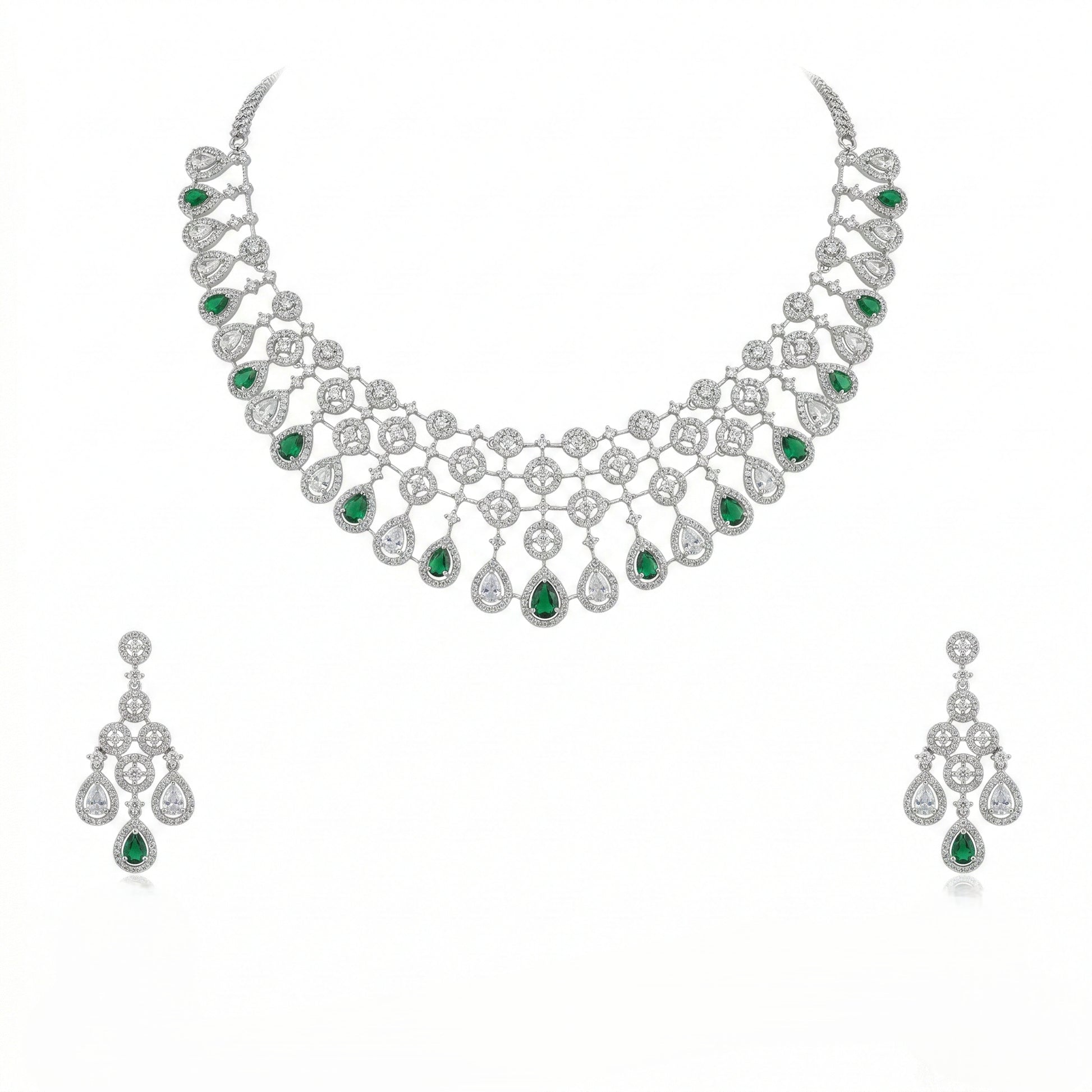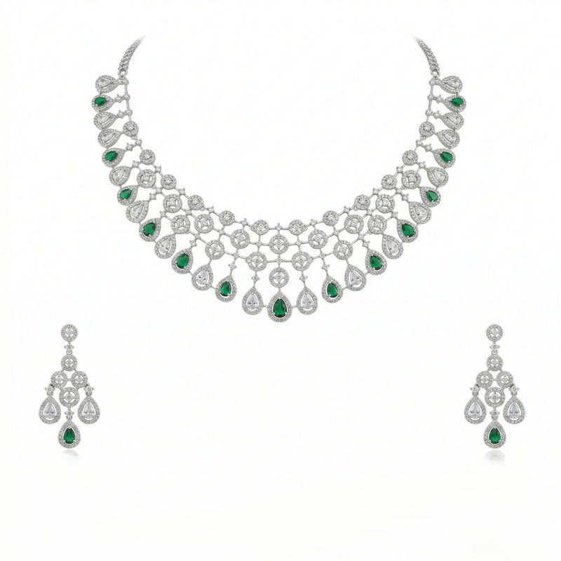 A celebration of intricate artistry, the Celestial Lattice Grand Necklace Set is handcrafted on a brass base and elevated with AAA grade American diamonds and luminous stones.