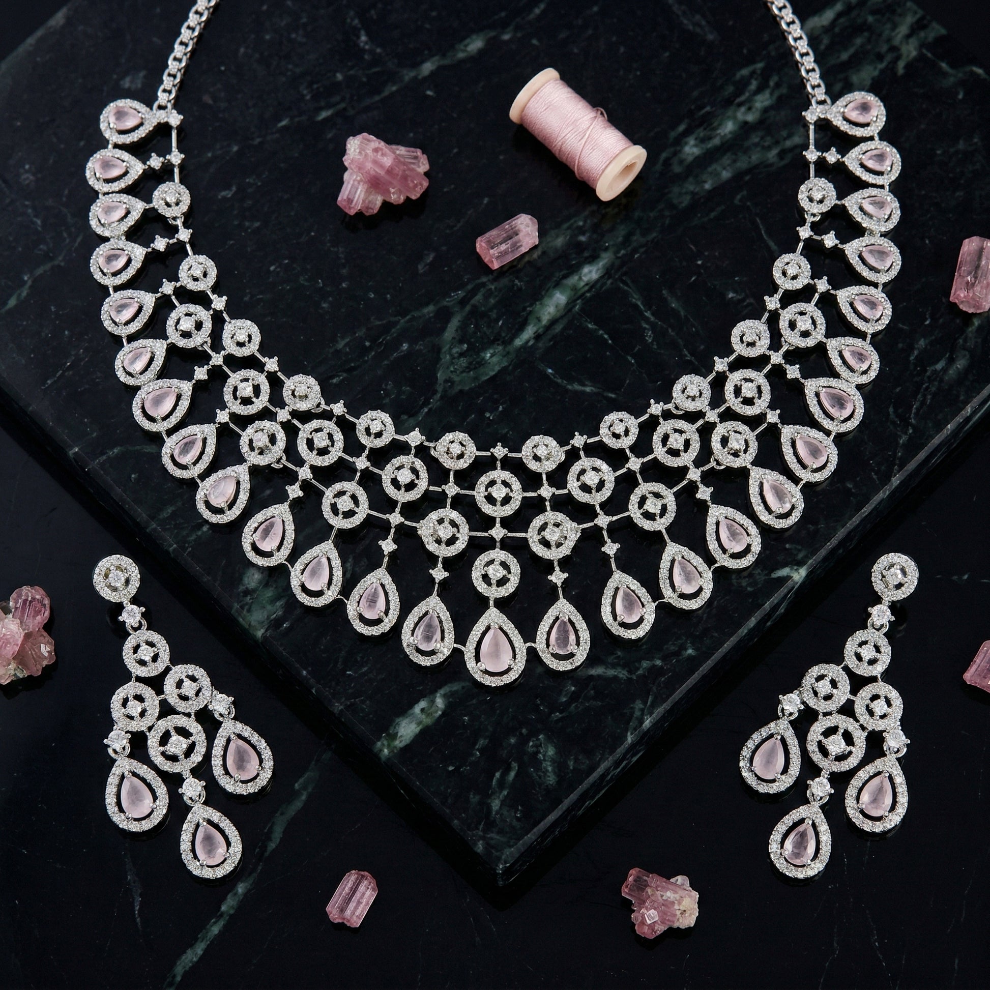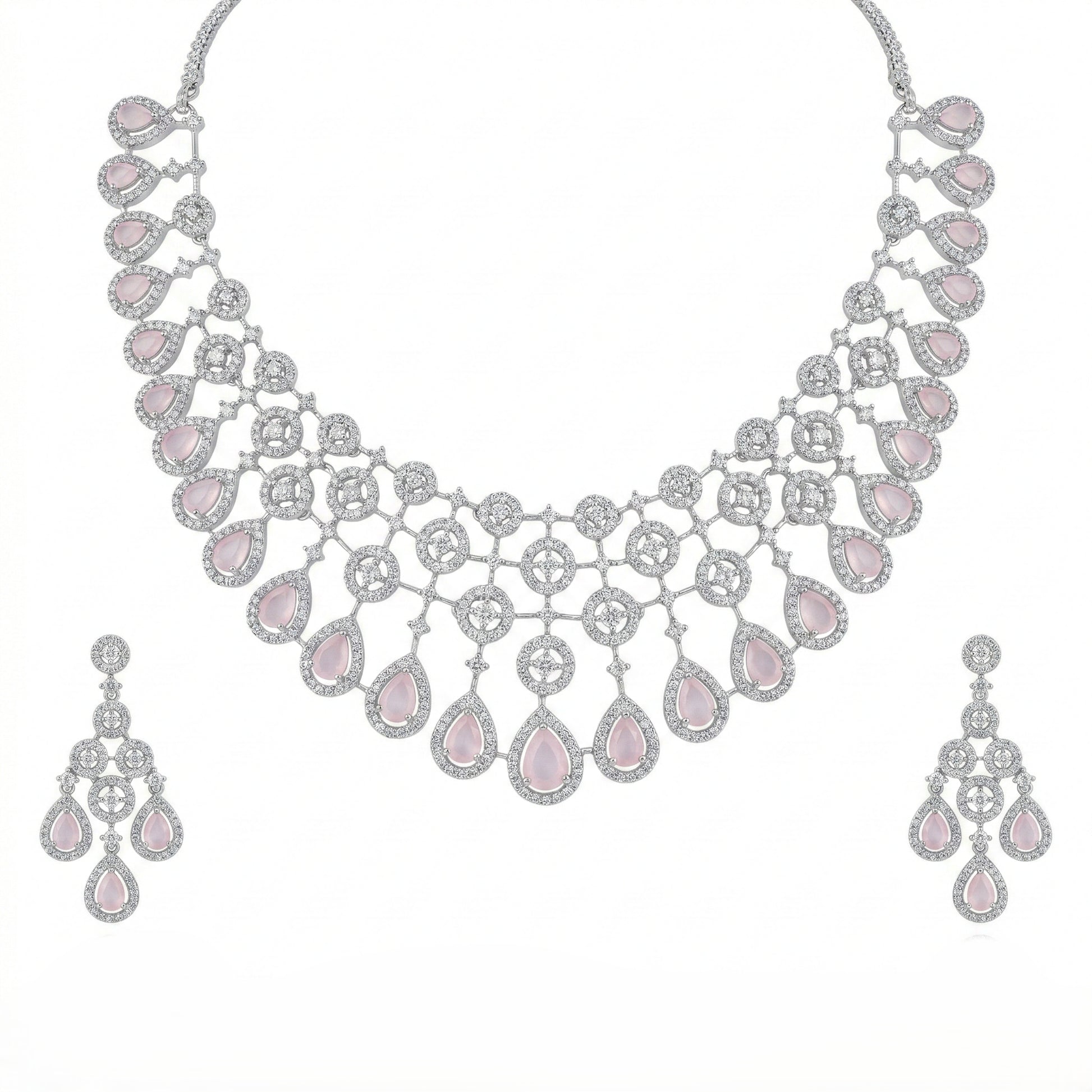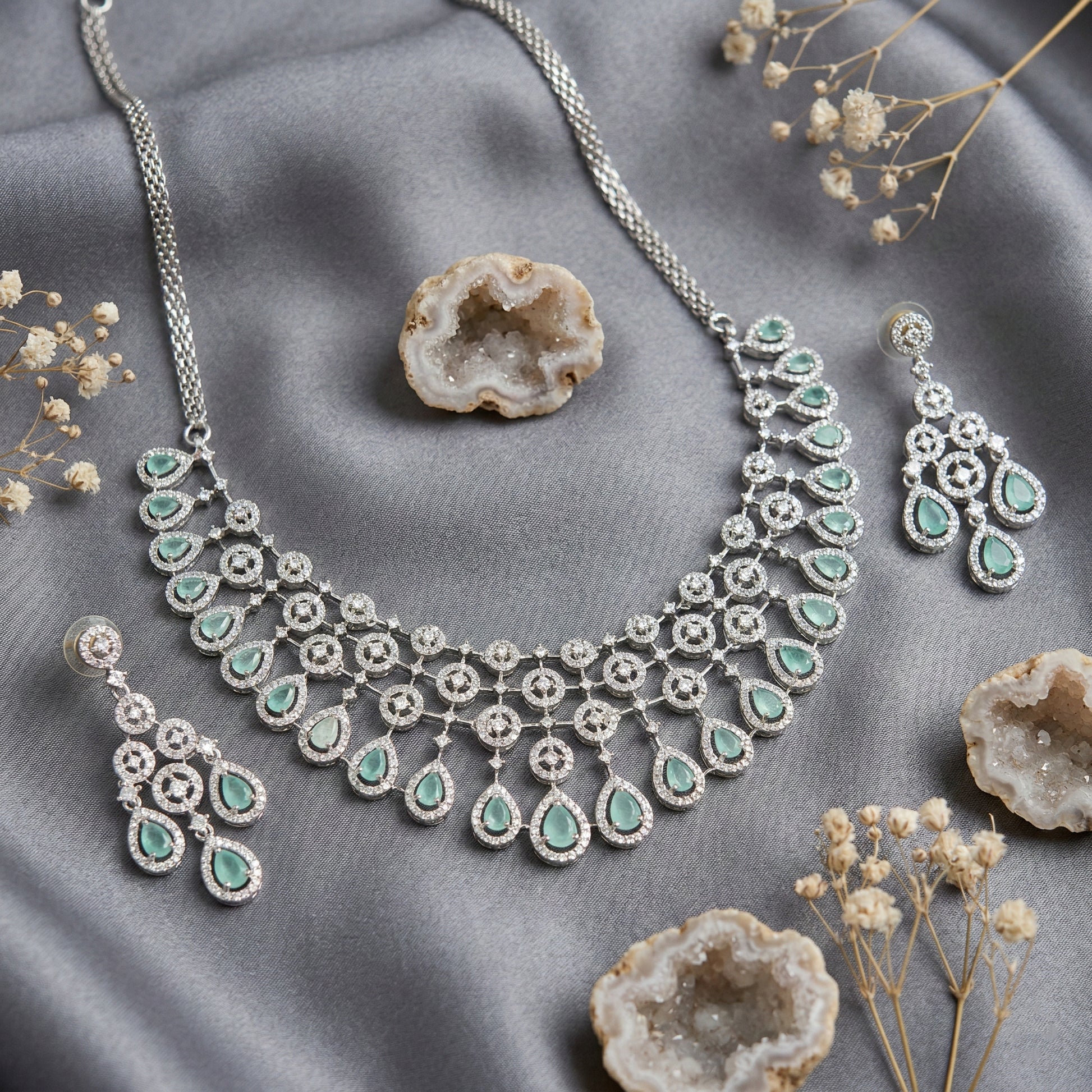 A celebration of intricate artistry, the Celestial Lattice Grand Necklace Set is handcrafted on a brass base and elevated with AAA grade American diamonds and luminous stones.