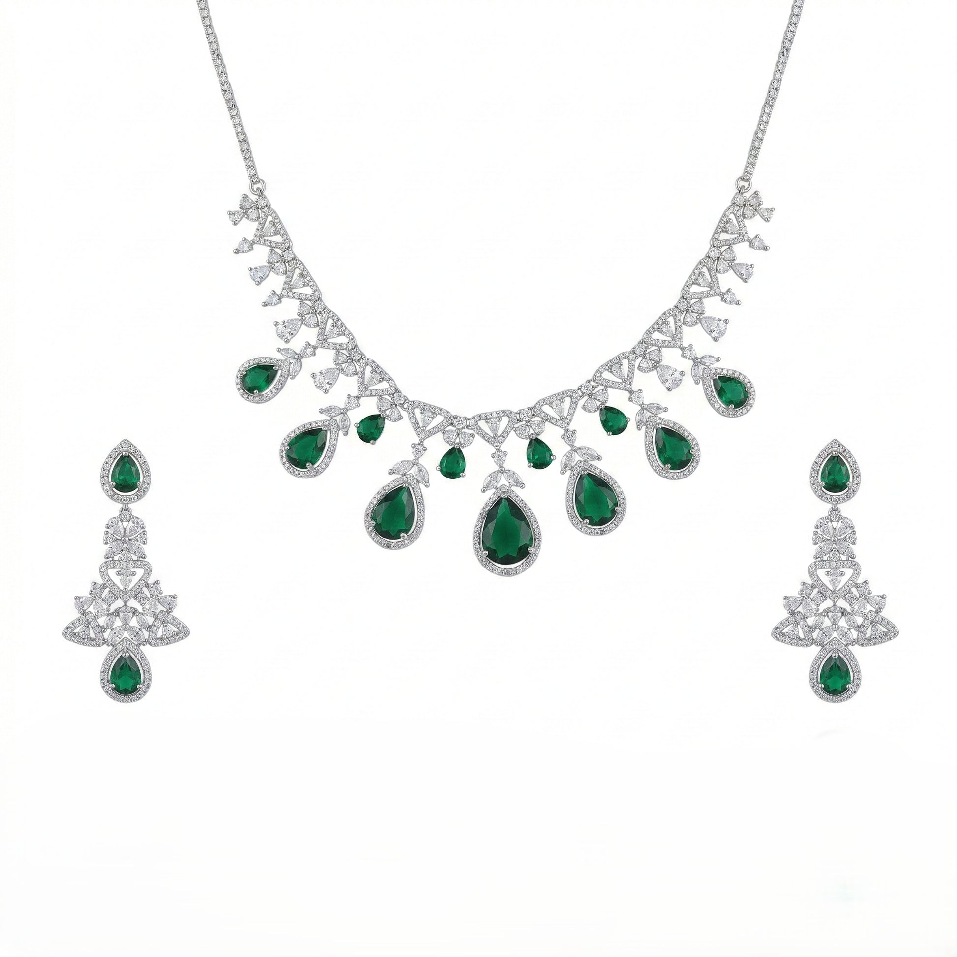 Inspired by royal filigree gardens, the Majestic Vine Drop Necklace Set features intricate handcrafted detailing on a durable brass base. Embellished with AAA grade American diamonds and finely cut stones, this piece delivers layered brilliance and graceful movement.